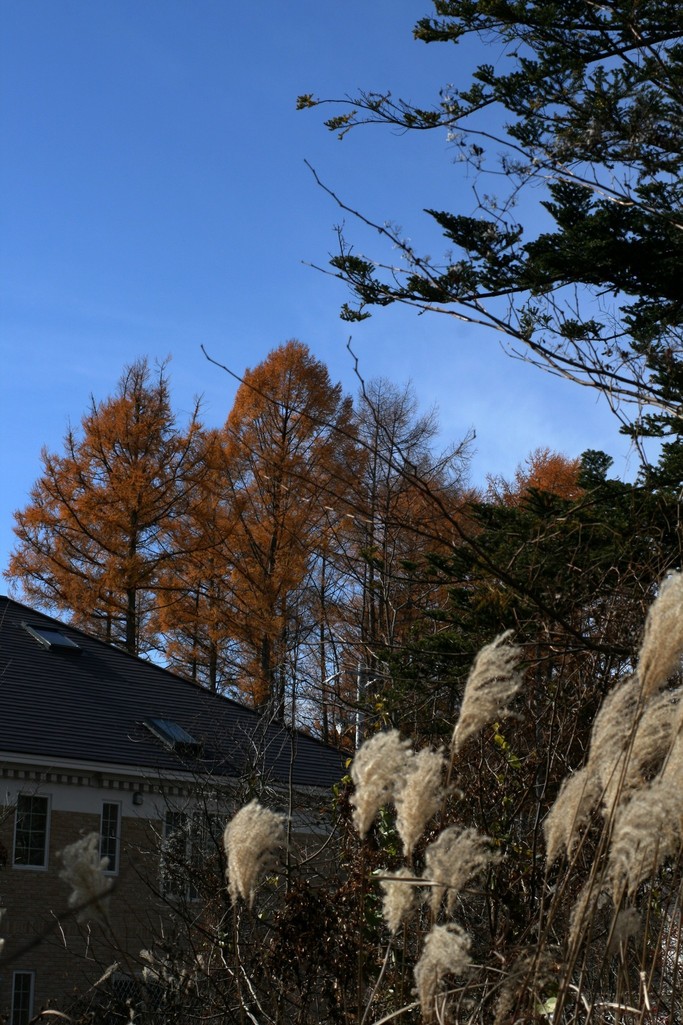 近所の景色。すっかり綿毛になったススキの穂の向こうにはもう半分くらい葉を落としたカラマツがそびえています。