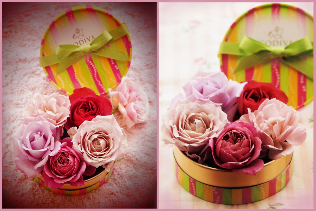 おしゃれな写真ですね!チョコの可愛い箱に座っているバラさんたちもチャーミングですね!