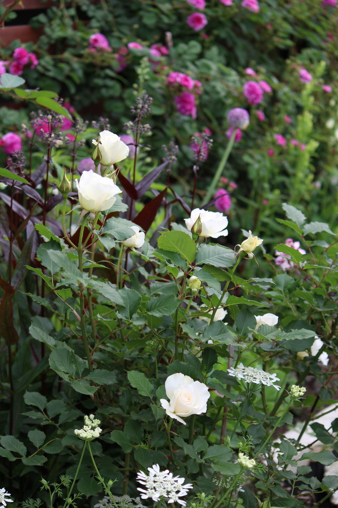 春の花壇 白い薔薇はマーガレットメリル 奥はオールドローズ ルッセリアナ