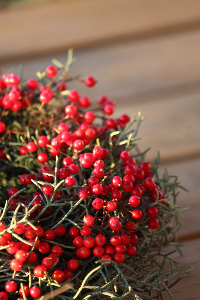 お庭のコニファー・ブルーアイスと子供達と近所でとってきた赤い実で クリスマスのリース作り。「リボンはどんなの付けようか?」なんて2boysに真剣に相談する私。すごく楽しい時間ですわ〜
