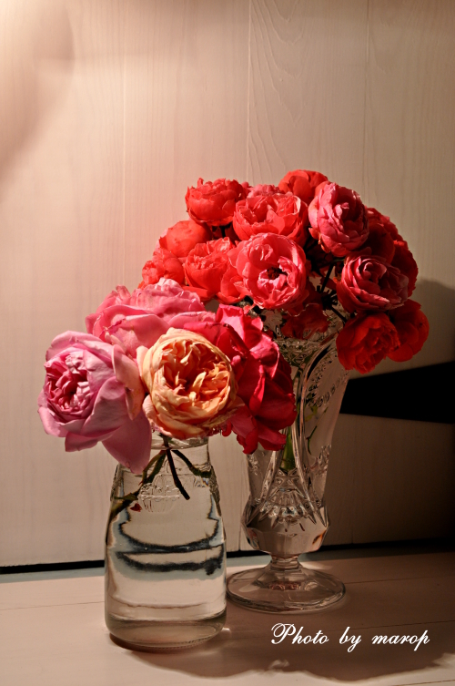白熱等の灯りはいいですね。私も大好きです。夜の薔薇の少しあやしげなふんいきも伝わってきました。バラ達は夜をどうして過ごしているのかしらね。うふっ。
