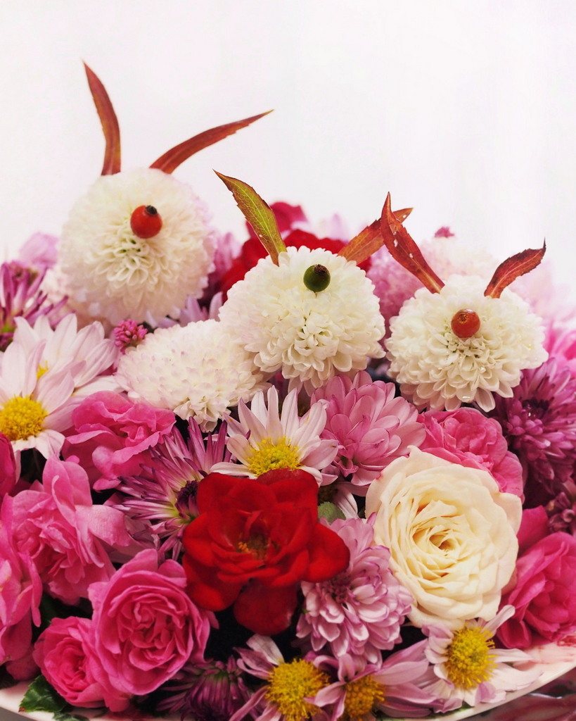 ポンポン菊にお耳とお花をつけて可愛いうさぎちゃんに大変身ですね。とっても可愛いです。