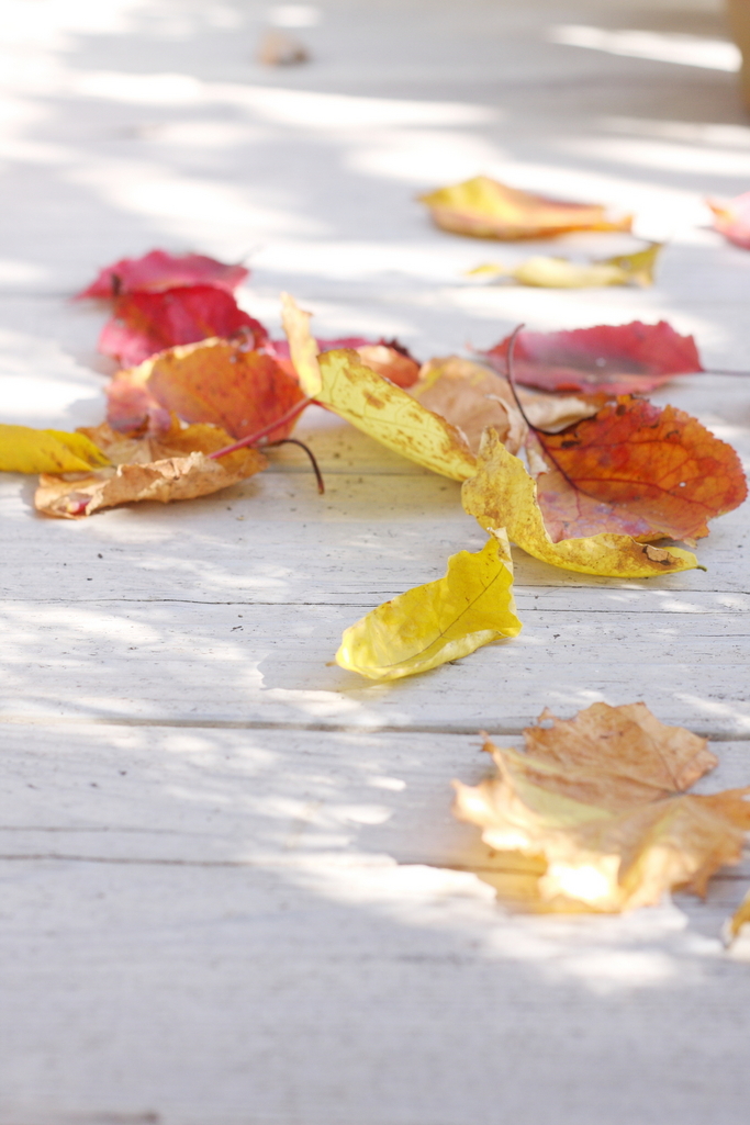 デッキに吹き寄せられた落ち葉