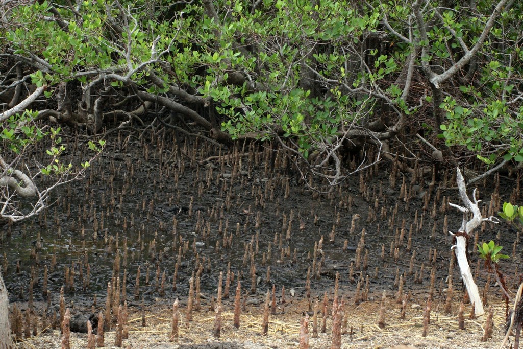 西表島から由布に渡る水牛車乗り場の近くに広がるマングローブの根元に林立していた気根。まるで針の山みたい。