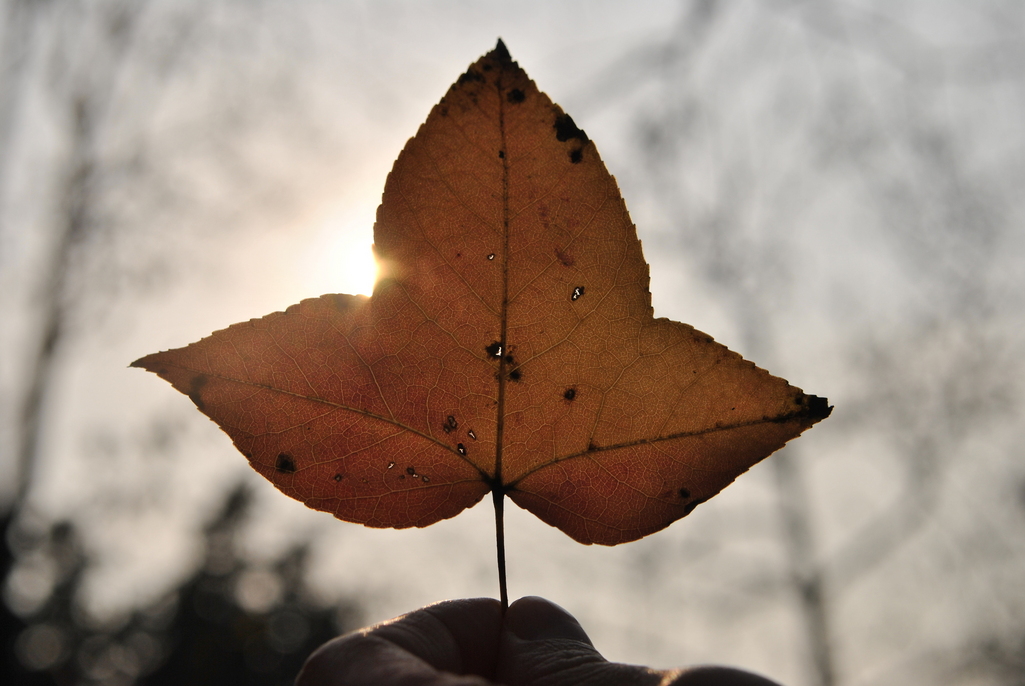 光にかざした落ち葉、晩秋の一こまを感じ、光の温もりさえ感じます。