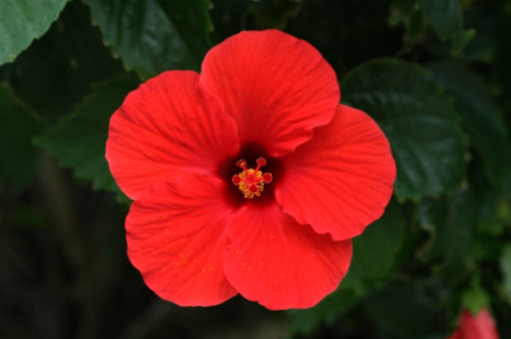 定番の赤いハイビスカスですが、花びらが丸く、正面から見ると大きな梅の花の様な形です。