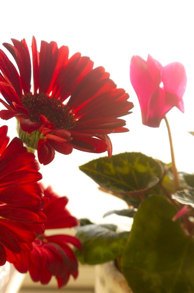 キッチンの出窓のガーベラとシクラメンが朝日を浴びながら、何やら談義してるかのような姿が眩しい~~☆