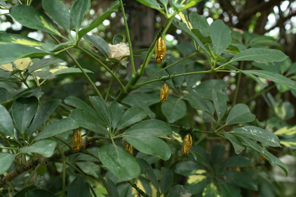 オオゴマダラという蝶の黄金の蛹。昨年別の形で紹介しましたが、こちらは西表の由布島で蝶の放し飼いの施設での光景です。木の枝に沢山ぶら下がっていてイヤリングにしたいくらいでした。