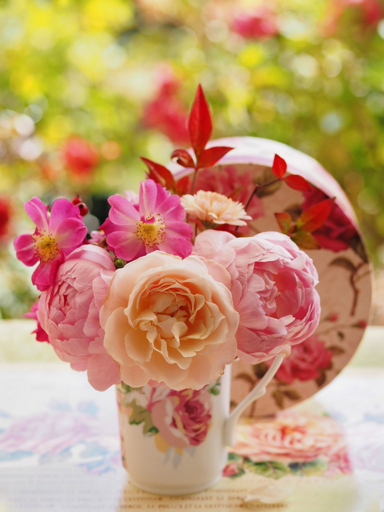 絶妙な色合いとお花どうしの重なり合いがとても素敵です。花器とのバランスもとてもやさしげで見ていてにっこりしました。