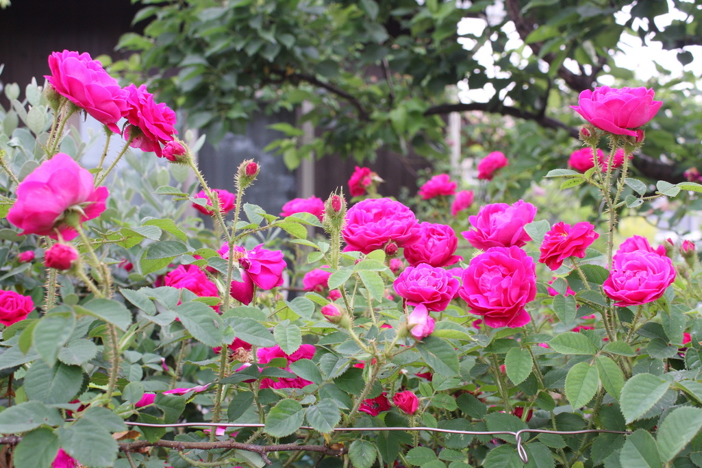 満開のショッキングピンクのバラがお庭をにぎやかにしてくれてますね。