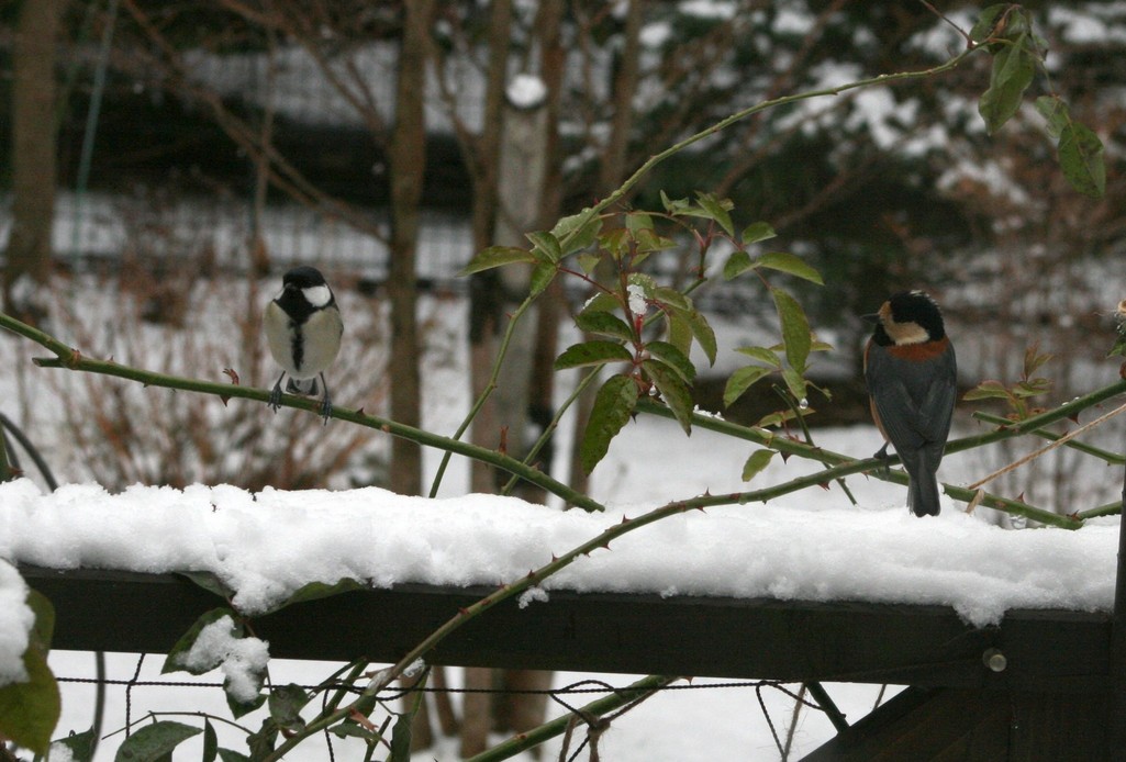 エサ台の近くのバラの枝にとまって、お互いに牽制し合っているヤマガラ君とシジュウカラさん。
