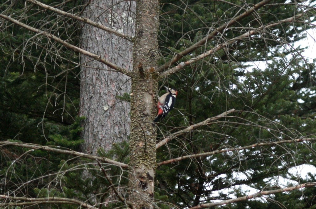 庭の枯れ木にやってきたアカゲラ。