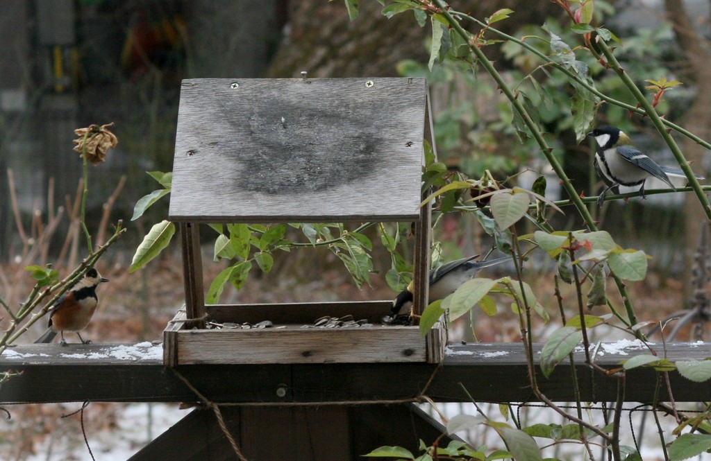 シジュウカラとヤマガラがエサ台を争っています。右上のシジュウカラが羽を開いてヤマガラを威嚇しています、この行動はシジュウカラ同士でもします。