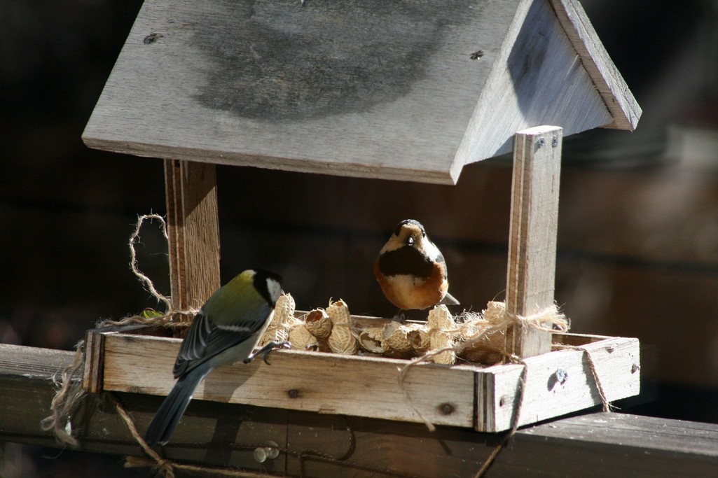 エサ台のピーナッツを間に挟んで、シジュウカラとヤマガラが睨み合い。
