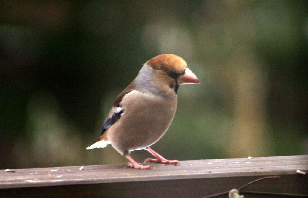 遠くの木の枝にとまっては人気のない時を狙っていたシメ君。ついにデッキの手摺りまでやってきました。