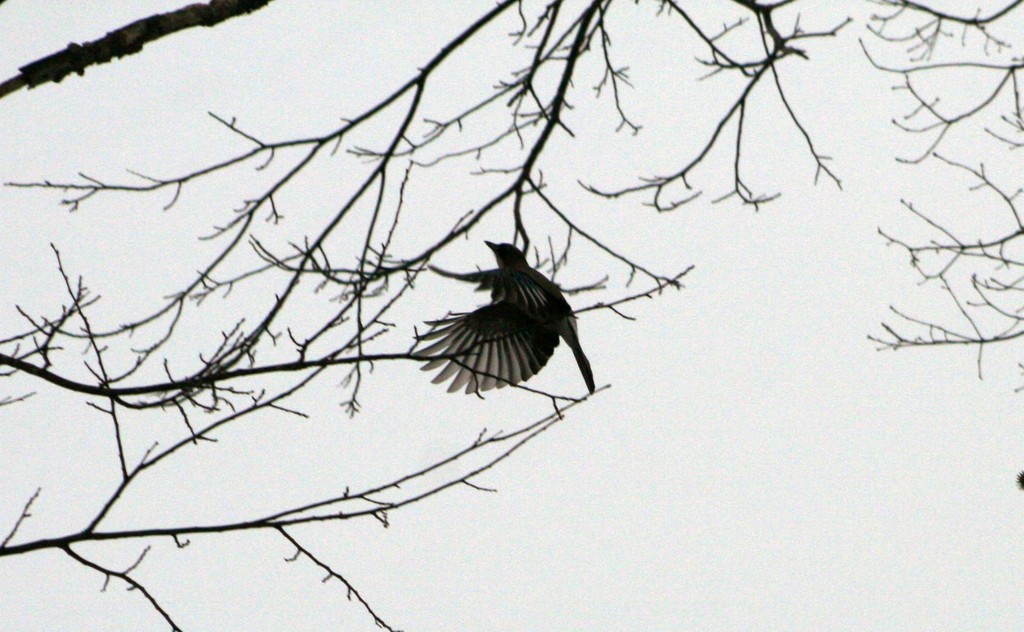 高い木の上から飛び立つカケス。大型の鳥は飛翔する姿がとってもきれいです。