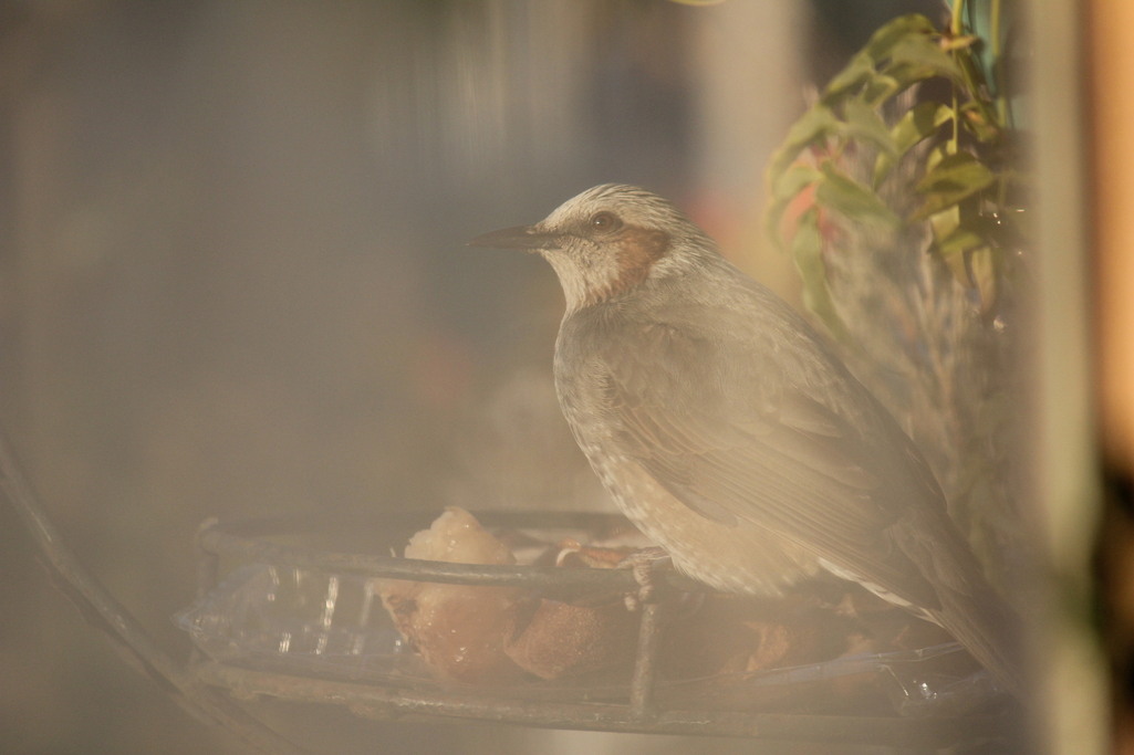 鳥の声で起床。我が家に来る野鳥は餌を食べて帰る時に「ごちそうさま!」とさえずって去っていくのでなかなかシャッターチャンスに恵まれませんでした。今朝、エサ台にいるヒヨドリ発見・・・・やっとの思いで水滴のついた窓ガラス越しですが撮ることができました。