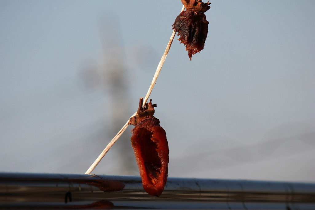 干し柿を野鳥の為に一本残して食べやすいようベランダのフェンスにかけておいたところ食い逃げされていました。