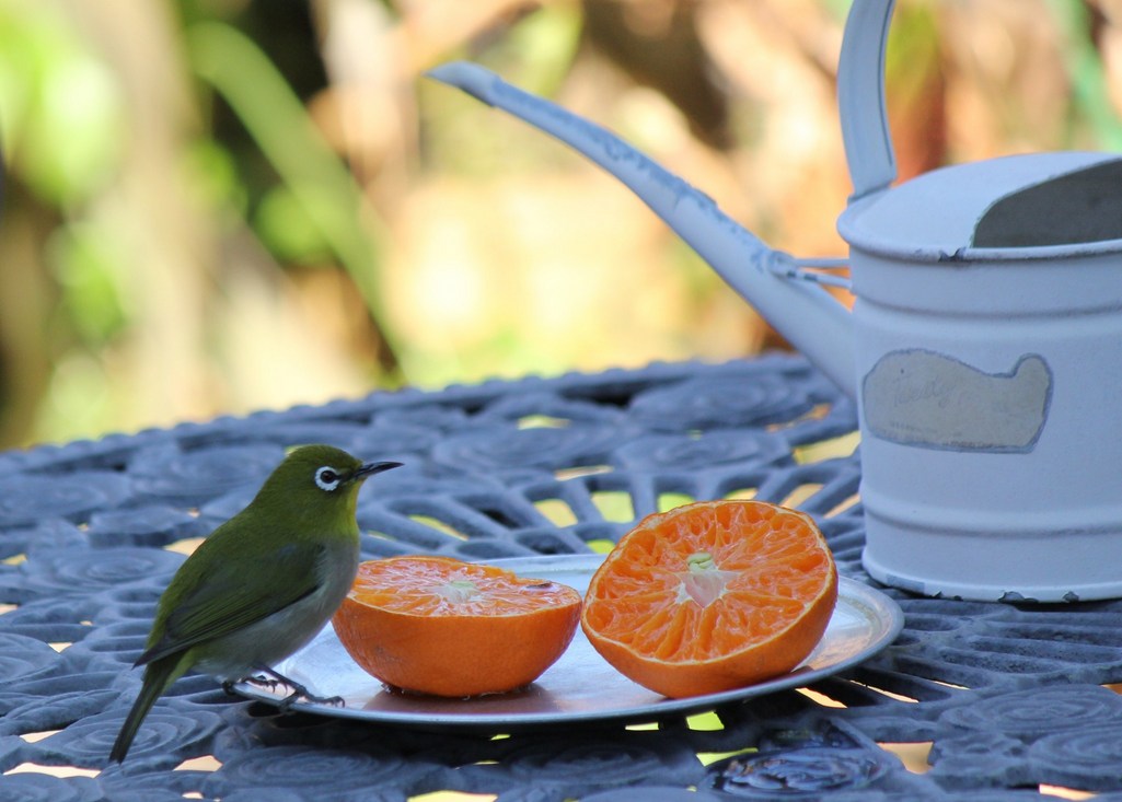 メジロとみかんと、ジョーロが静物画のように配置されて芸術ですね。