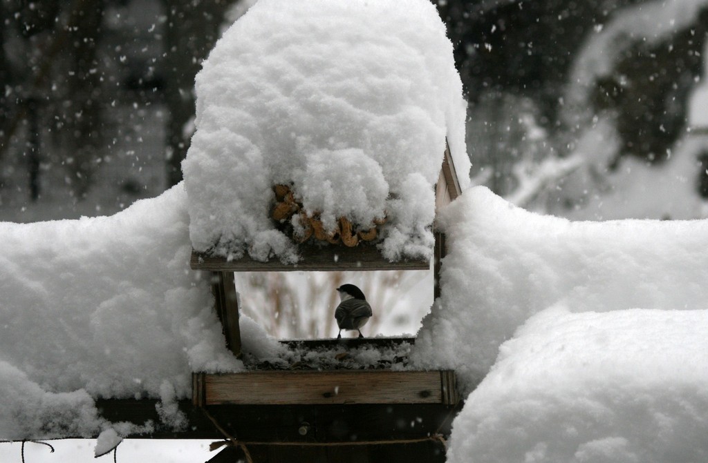 すごい雪ですね! こんな雪でも、鳥って体温が下がらないのかしら?そう考えるとすごいです。
