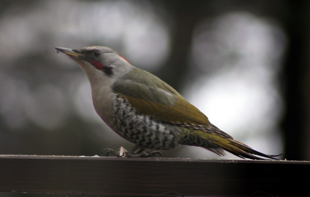 キツツキの中でも大型のこの鳥は迫力があります。デッキの手摺りの上に置いていいる牛脂を食べにやってきたところをパチリ。