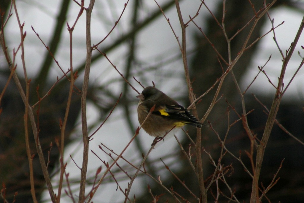 ご常連のヒワ類がエサ台を占拠している間、庭の姫シャラの梢でじっと待っているカワラヒワ。