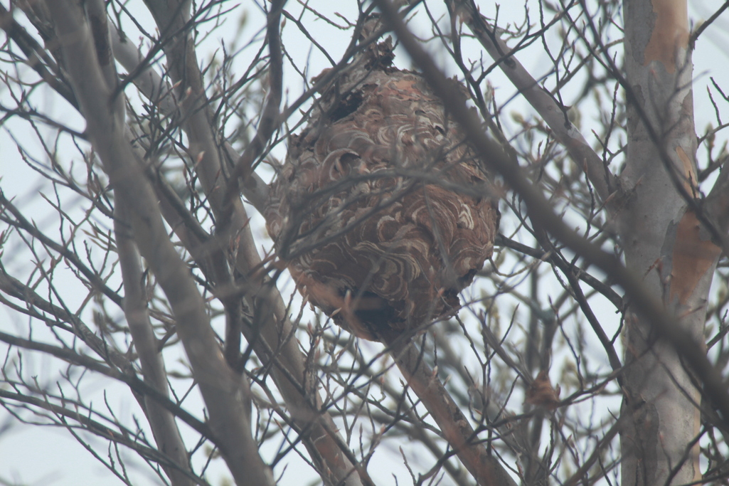 あの恐ろしいスズメバチの巣ですね。葉が茂っているときはわからなかったのが、秋から冬にかけて落葉すると思いがけず近くにあったりして驚かされます。でももうこの巣は御用済みですから心配ないですよ。
