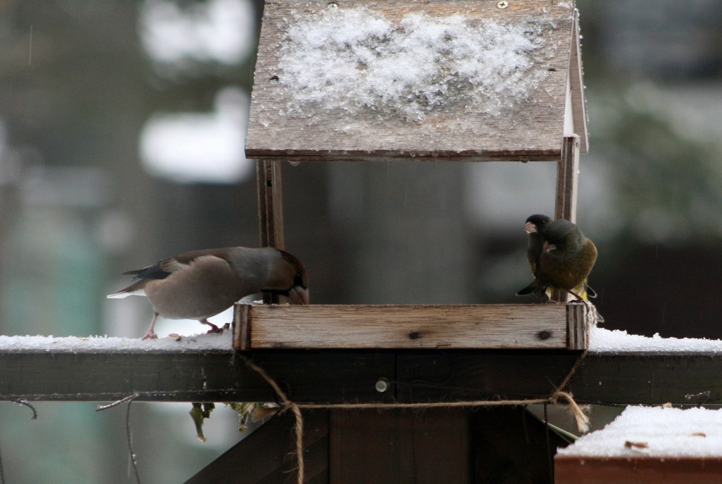 せっかくヒマワリの種を食べていたカワラヒワ、大きなシメが割り込んできたのを見て困っています。
