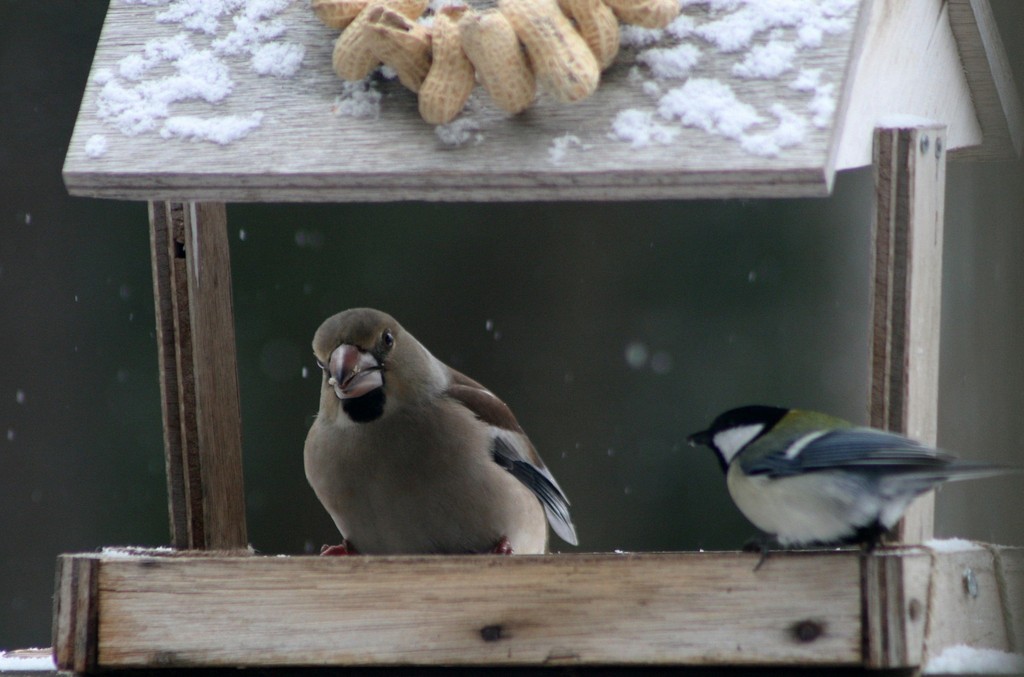 シメって大きいんですね。シジュウカラがとても小さく見えます。
