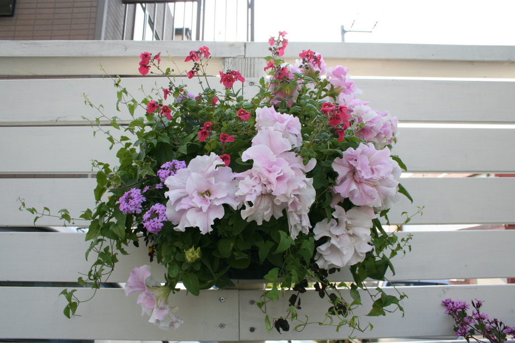 コテージガーデンの講習会で初めて作ったハンギングバスケットです。ピンクの色合わせがなかなかのお気に入りです。