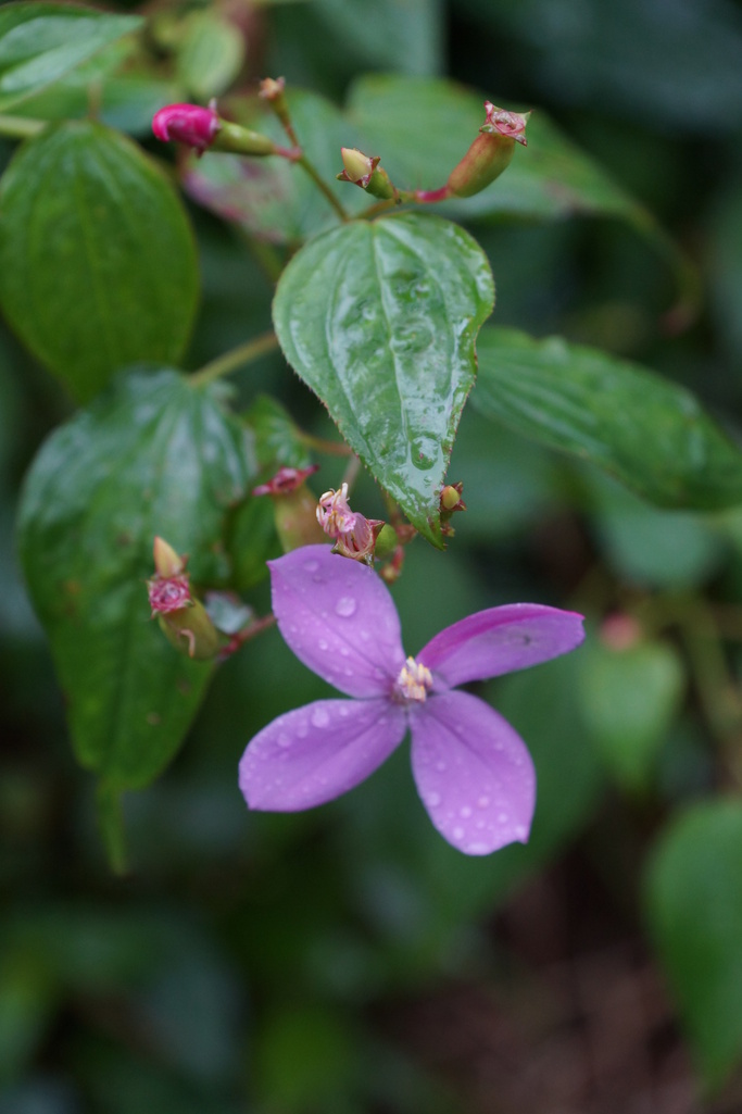 コウラウ山脈南麓のマノアの滝を目指してトレッキング。熱帯雨林の中、一際繊細なお花が^^ ノボタンの一種だそうです。花びらの裏に入る濃いピンクの縞が可愛い❤