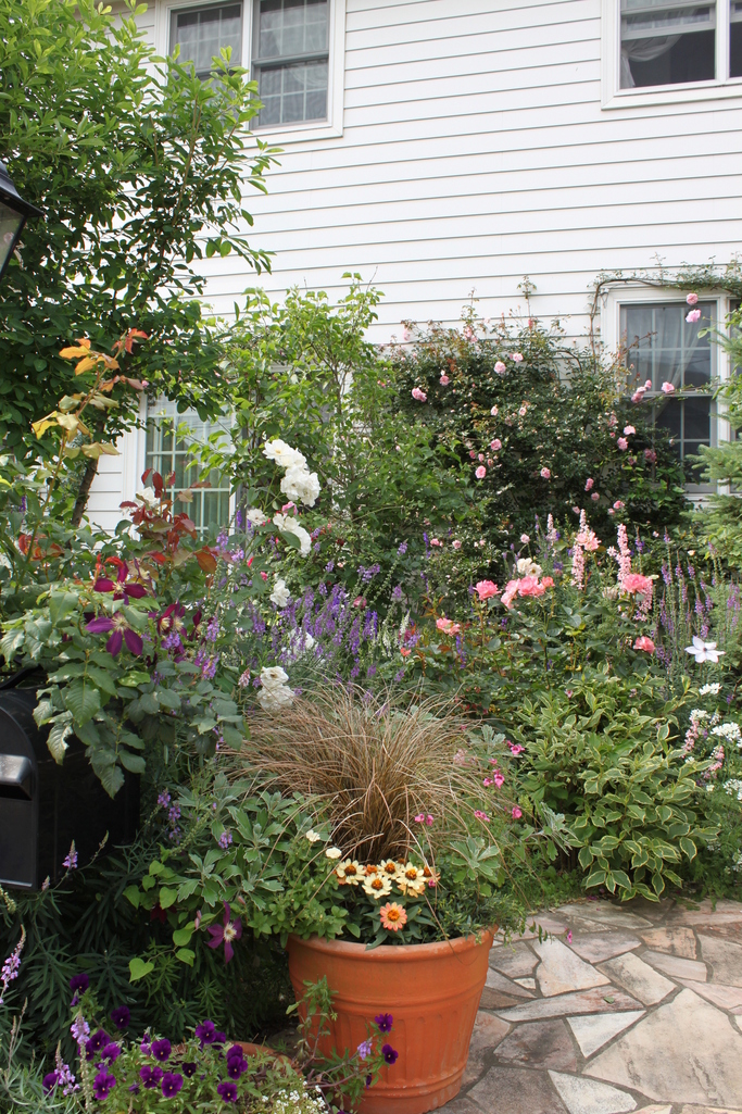 壁面の薔薇が、フランソワ・ジュランヴィル植えて4年目です。生育旺盛です。一番手前の白い薔薇は、アイスバーグ。こちらは、うちの庭では、なかなか成長しないです