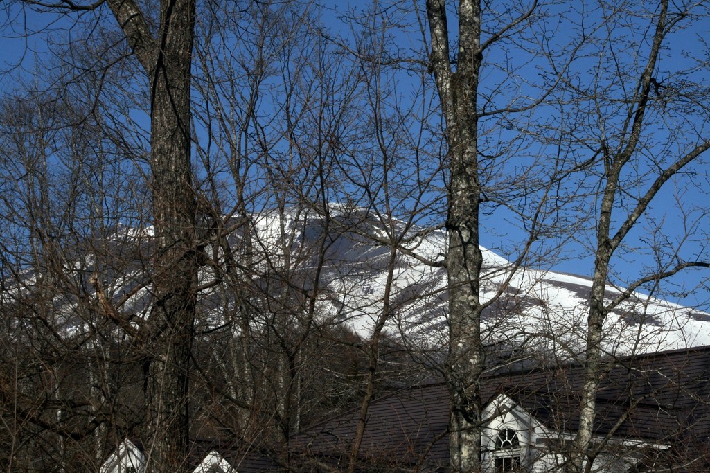 冬枯れの木立の向こうに見えるのは浅間山。春になって木々が芽吹いて葉が茂ってくると隠れてしまいます。