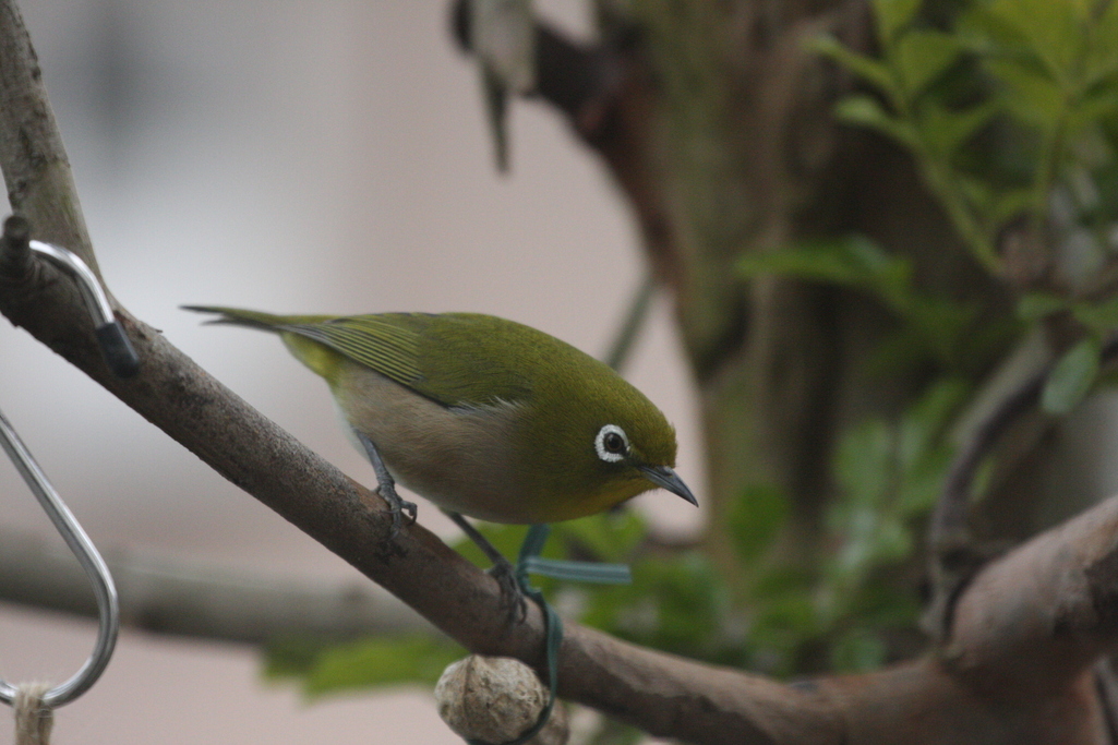 ヤマガラやシジュウカラがつつくのでピーナツに興味津々のメジロちゃん。
