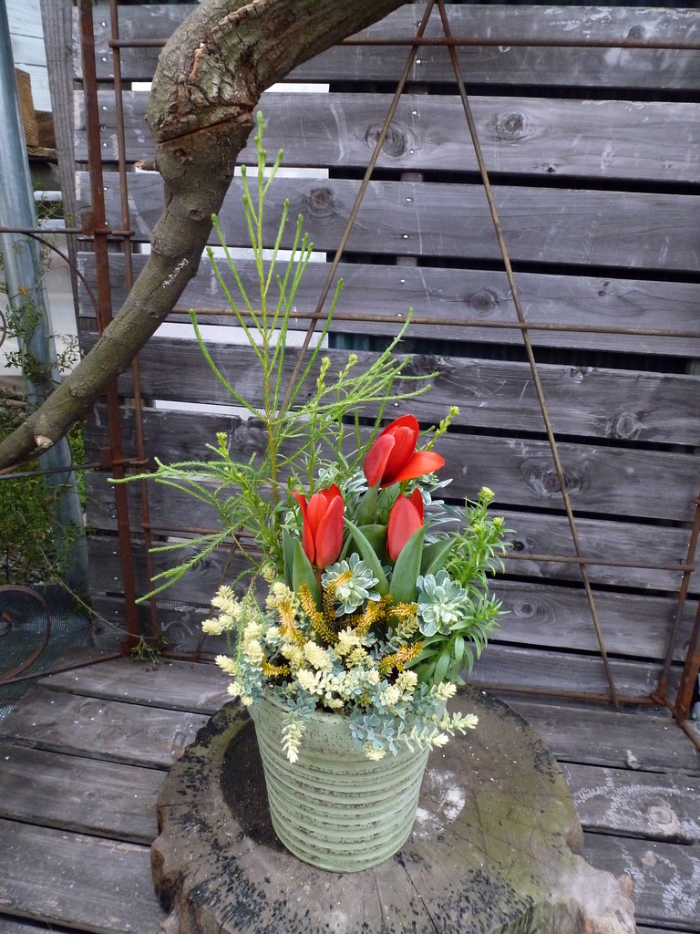 赤いチューリップを使った寄せ植えは初めて作りました。(;^-^A