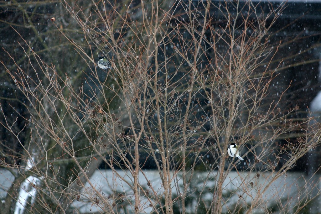 雪がだんだん激しくなる中、庭の姫シャラの枝にとまったシジュウカラもなんだかとっても寒そう。