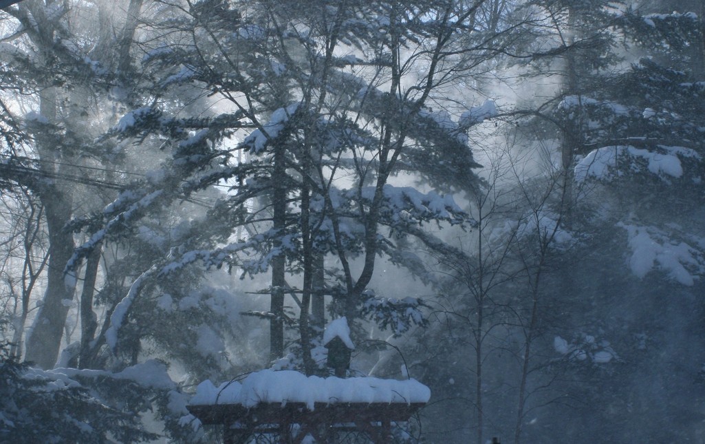 今朝は風が強く、木々に昨日積もった雪が風に舞い、周りが一瞬雪煙で真っ白になります。