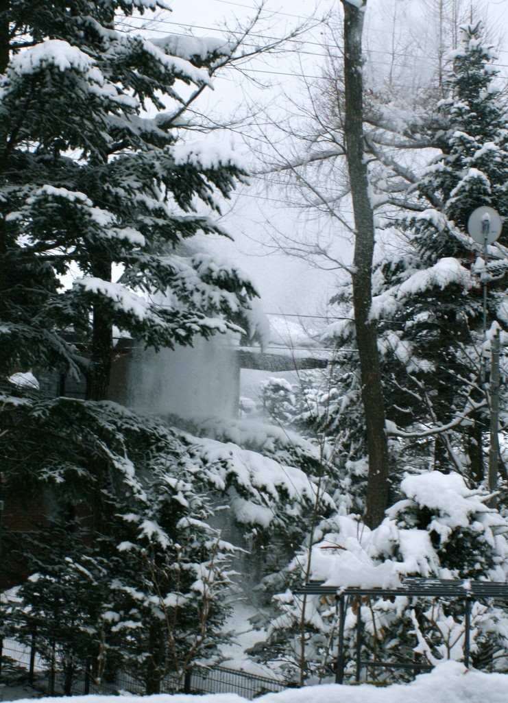 大きな木の上に積もった雪が、風に吹かれて飛ぶと時々大きな落雪になります。下にいると一瞬で真っ白な雪だるまに変身。