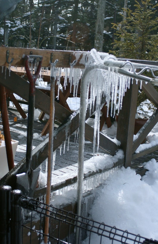 デッキの端にある雨どいが凍り付き、あふれた雪解け水がデッキの手摺りやスコップや物干しにまとわりついてたくさんのツララになっています。