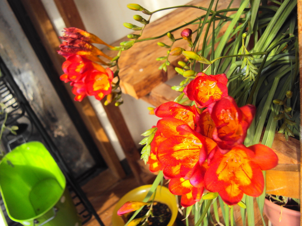 マンションの室内栽培のフリージアです。まもなく紫色のフリージアもつぼみが膨らんできているので、開花するでしょう。
