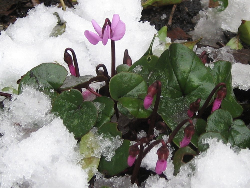 雪の中から春~って感じですね^^蕾もいっぱい上がっていて、これから楽しみですね。