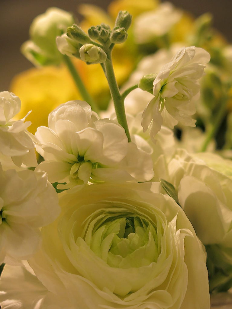 ラナンキュラスとストックのWhiteカラー。Whiteにもペールイエローグリーンのグラデーションが入り魅力的です。