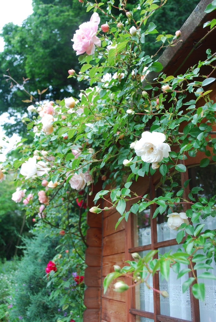 小屋屋根を伝うつる薔薇
