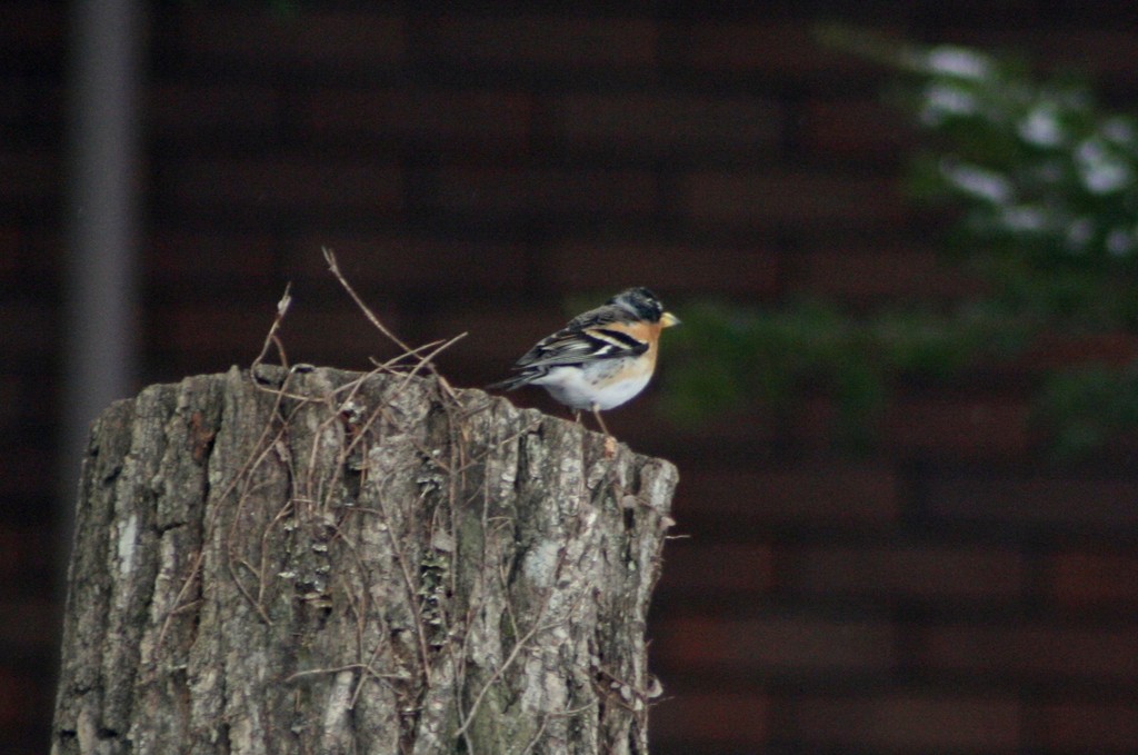 こちらは庭の栗の切り株にとまったアトリのオス。斜め後ろから見ると羽の彩りがきれいです。いつもはもう少し遅く10羽ほどの一団で来て、雪が解けた芝生の上で草の種などをついばんでいます