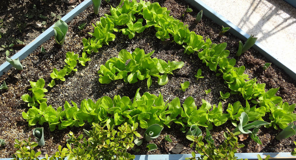 種まきを一工夫、その結果です。おにぎり型です。周りのチューリップの葉がぐんぐん大きくなってきています。