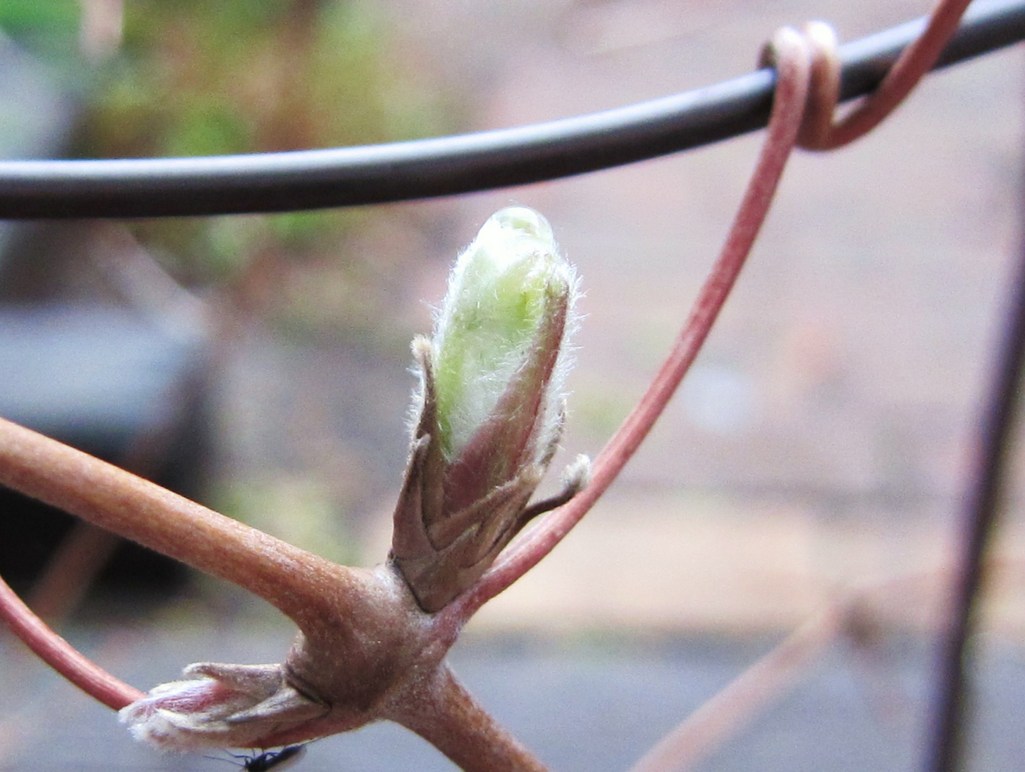 クレマチスの新芽、ツルもしっかり巻きついてます。