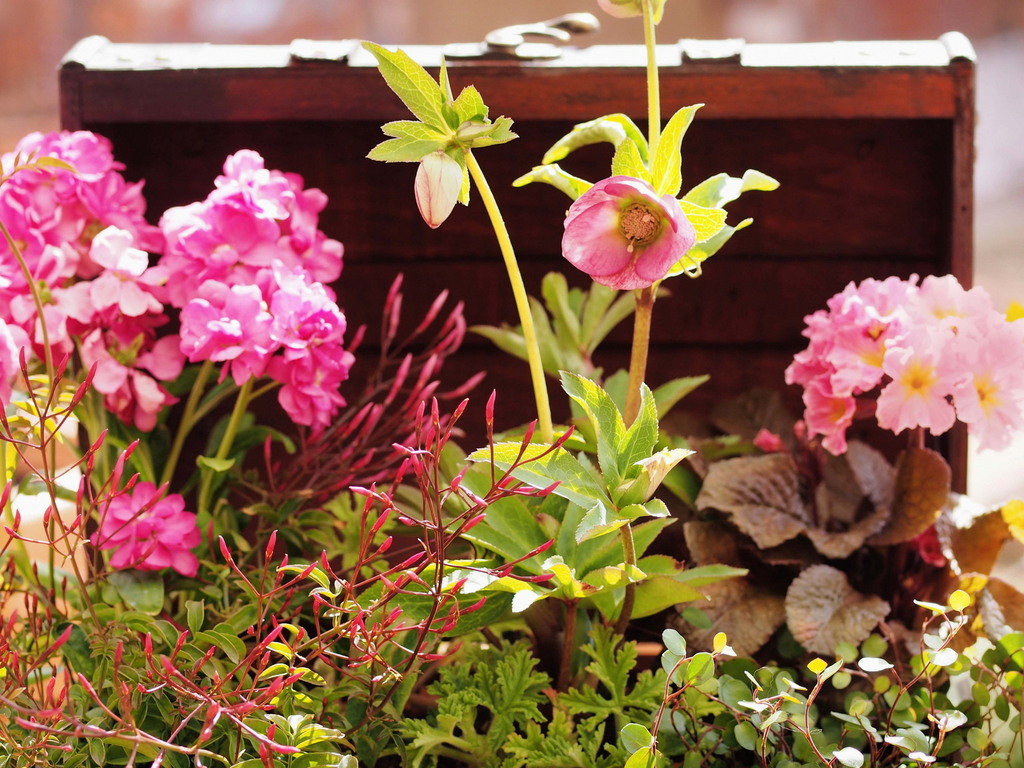 寄せ植えというか寄せ入れというか・・・^^; 可愛いピンクのクリスマスローズが咲いたので、ほかの花とあわせて飾ってみました(^_-)-☆