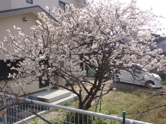 サクランボとフェンス越しにバラのバタースコッチ植えていまして