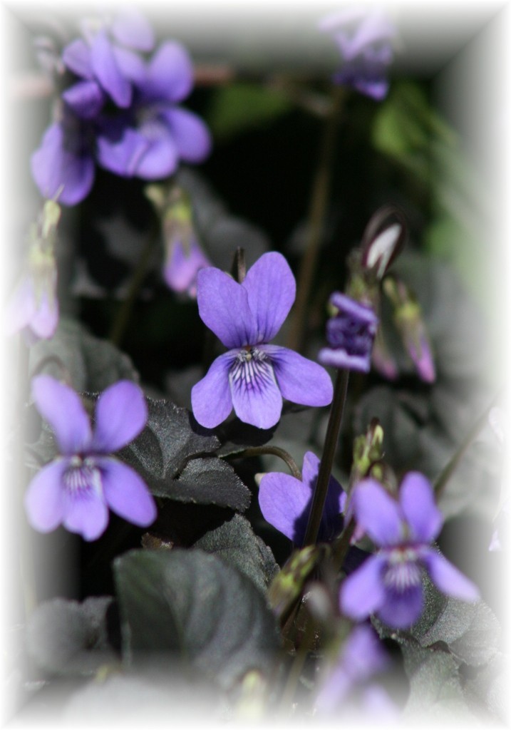 春はやっぱりスミレ。窓辺の鉢植えの銅葉のスミレが満開です。