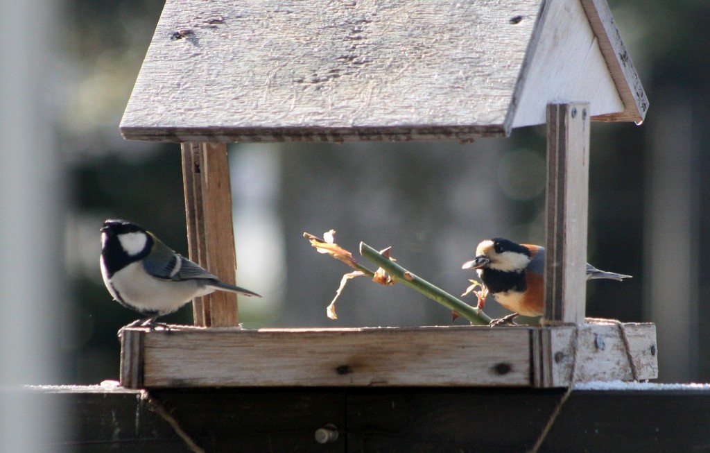 特に仲がいいわけではありませんが、同じエサ台で一緒についばんでいます。